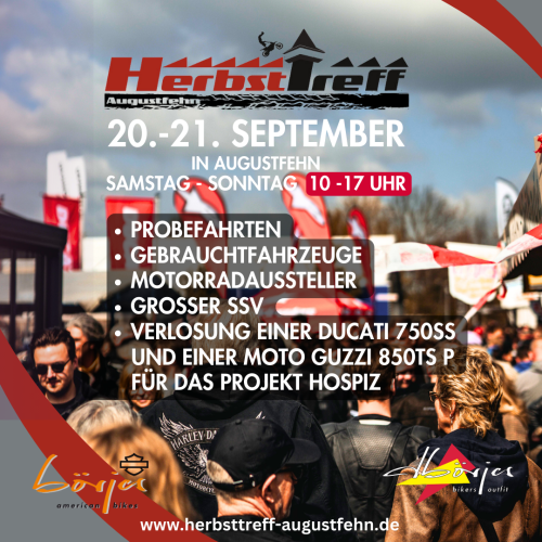 Am Samstag und Sonntag, 20. & 21. September, jeweils von 10 bis 17 Uhr, heißt es wieder: Herbsttreff in Augustfehn. Auf dem Eisenhüttengelände wartet ein starkes Programm rund ums Motorrad.